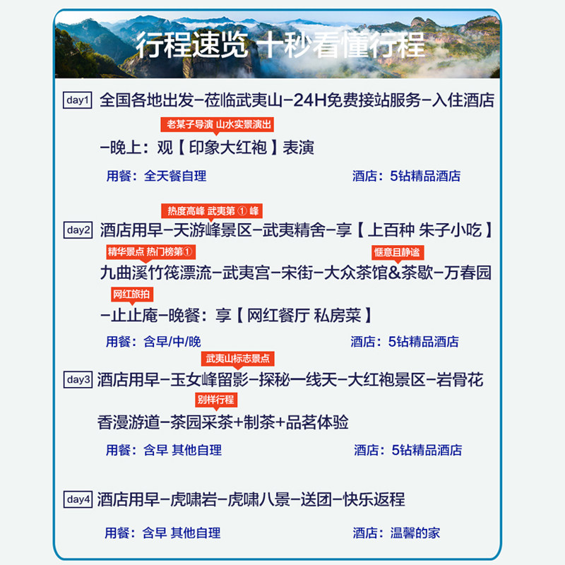 行程包含《印象大红袍》等山水实景演出,将武夷茶文化与现代舞台艺术结合,打造沉浸式夜间体验。差旅人士可在晚餐后轻松前往,无需额外安排行程。演出时长约70分钟,内容精炼震撼,既丰富了夜间生活,又避免过度疲劳,完美契合差旅者对‘短时高效娱乐’的需求。