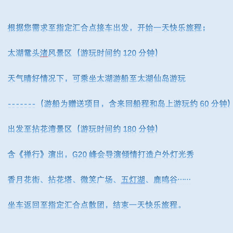 本行程专为无锡本地或周边差旅人士设计,无需长途奔波,当日即可开启高品质度假体验。全程配备专属车辆与资深导游,灵活安排时间,兼顾商务出行的高效与休闲度假的惬意。无论是会议间隙的小憩,还是周末短途放松,都能轻松实现无缝切换,真正实现“说走就走”的差旅休闲一体化。