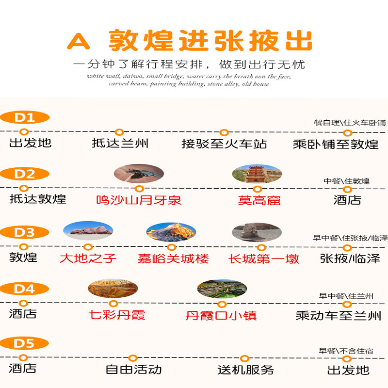5天4晚的紧凑行程专为忙碌的职场人量身打造,既不过度压缩体验,又能高效利用年假或调休时间。从抵达敦煌开始,依次游览鸣沙山月牙泉、莫高窟、嘉峪关关城、张掖七彩丹霞等核心景点,节奏张弛有度,避免疲劳奔波。每日安排合理,留有缓冲时间应对航班延误等差旅常见问题,确保您在有限时间内深度感受丝路文明与自然奇观。
