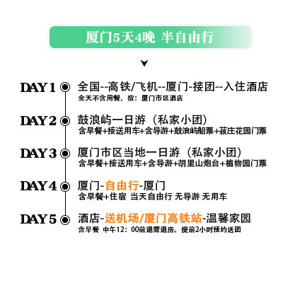 本行程专为从厦门本地出发的差旅人士设计,首日即提供机场或高铁站至酒店的专属接驳服务,省去交通转乘烦恼。无论是商务出差后顺道度假,还是会议间隙开启休闲之旅,都能无缝衔接旅程。全程使用舒适车辆,由经验丰富的司机接送,确保您在繁忙差旅之余也能轻松开启海岛慢生活,真正实现‘落地即度假’的高效出行体验。