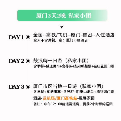 针对时间宝贵的差旅人群,提供一站式无忧服务:含鼓浪屿往返船票、精选酒店住宿、专属用车及景点门票。无需自行规划路线或排队购票,导游全程协助安排行程细节,让您从落地厦门起便专注享受旅程,最大化利用短暂假期,回归工作时神清气爽。