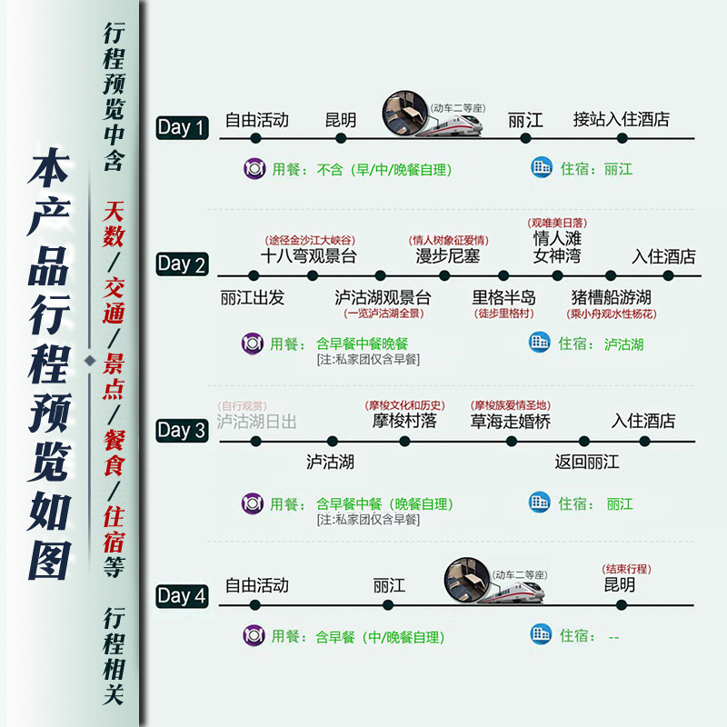 本行程采用昆明出发的动车交通方式,大幅缩短路途耗时,特别适合差旅人士在有限时间内兼顾工作与度假。抵达丽江后即转为独立私家团服务,全程无拼团、无购物,灵活安排节奏,让您在完成公务之余,轻松沉浸于泸沽湖的自然风光与摩梭文化之中,实现高效差旅与深度体验的完美融合。