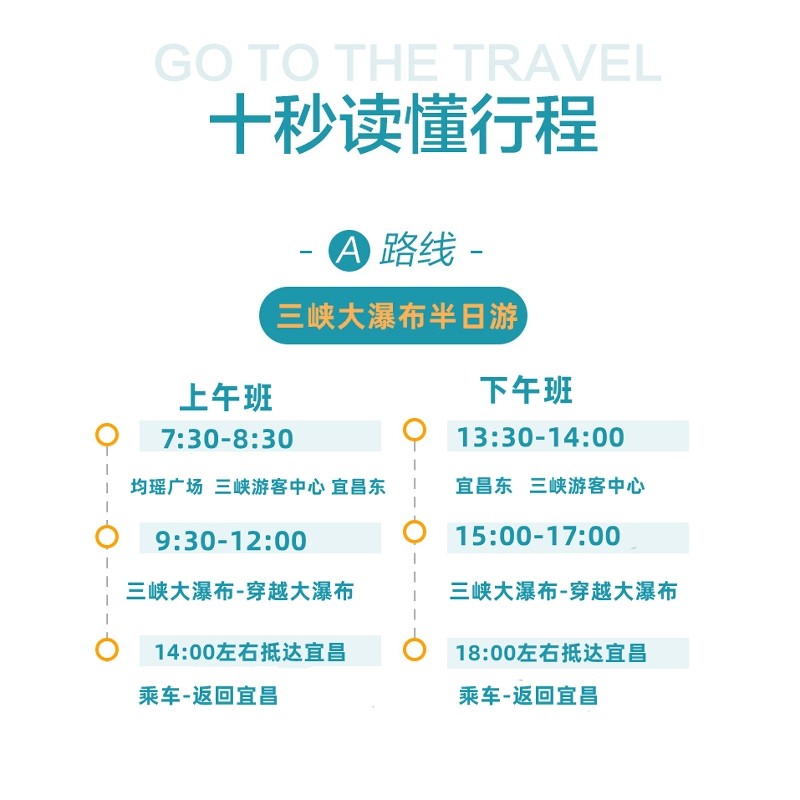 考虑到差旅人士时间宝贵,本线路采用半日游设计,仅需半天即可完成核心景点游览。无论是上午班次配合下午返程,还是下午班次衔接上午会议,都能精准匹配您的差旅节奏。高效利用碎片化时间,畅享三峡大瀑布的震撼景观,不耽误后续行程安排。