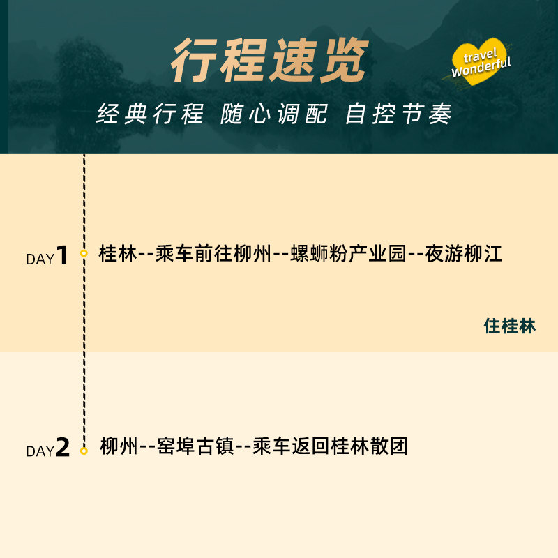 桂林与柳州同属广西核心城市,高铁通达仅需1小时左右。本2日游产品精准匹配高铁时刻,首日中午前出发、次日晚返程,完美嵌入周末或小长假。差旅人士无需额外请假,即可完成一次高质量短途度假,最大化利用碎片化时间,实现工作与生活的高效平衡。