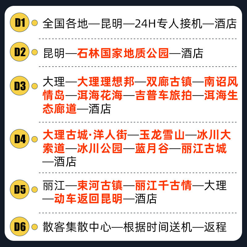 本行程专为差旅人士设计,从昆明出发,覆盖大理、丽江等热门目的地,全程一价全含,无需额外支付景点门票、交通或餐食费用。特别适合时间紧凑但希望高效体验云南精华的商务旅客,6天5晚的行程安排合理,兼顾工作与休闲,让差旅也能变成一场身心放松的度假之旅。