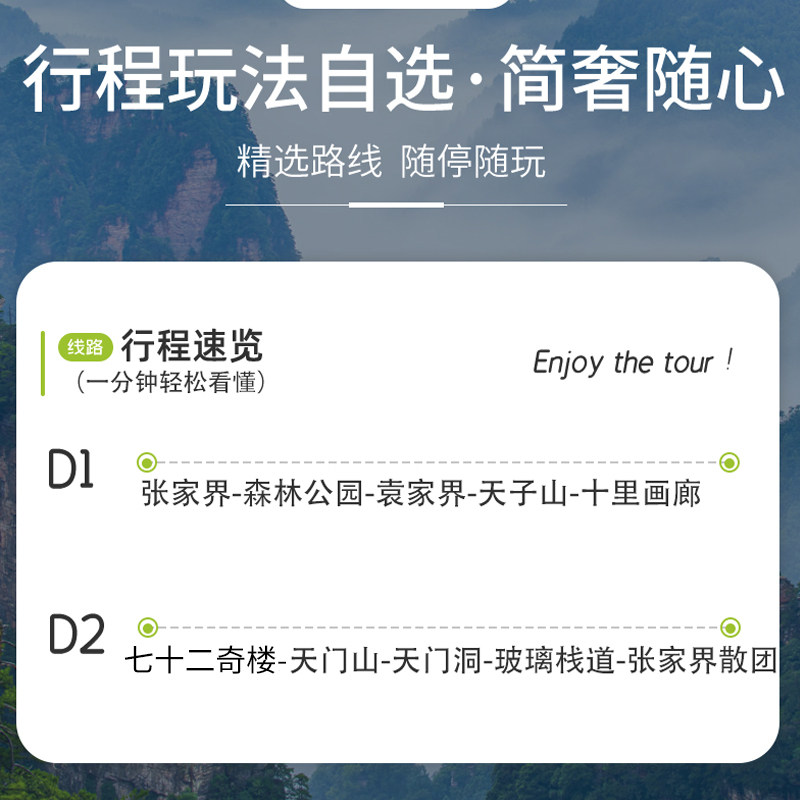 本行程支持1人单独预订,无需拼团等待,特别适合出差途中临时起意或时间紧凑的商务人士。从长沙或张家界出发均可便捷衔接,2天1晚的紧凑设计让您在完成工作之余轻松打卡世界自然遗产地。全程纯玩无购物,省去冗余环节,最大化利用碎片化假期,真正实现高效差旅与深度度假的完美融合。