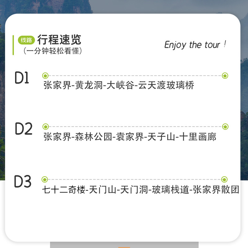 本产品专为追求深度体验的差旅人群设计,涵盖张家界国家森林公园、黄龙洞、天门山三大世界级景点,融合地质奇观、溶洞探秘与森林生态,让短暂假期不止于走马观花,更是一场沉浸式的自然与文化之旅,满足商务人士对品质旅行的期待。