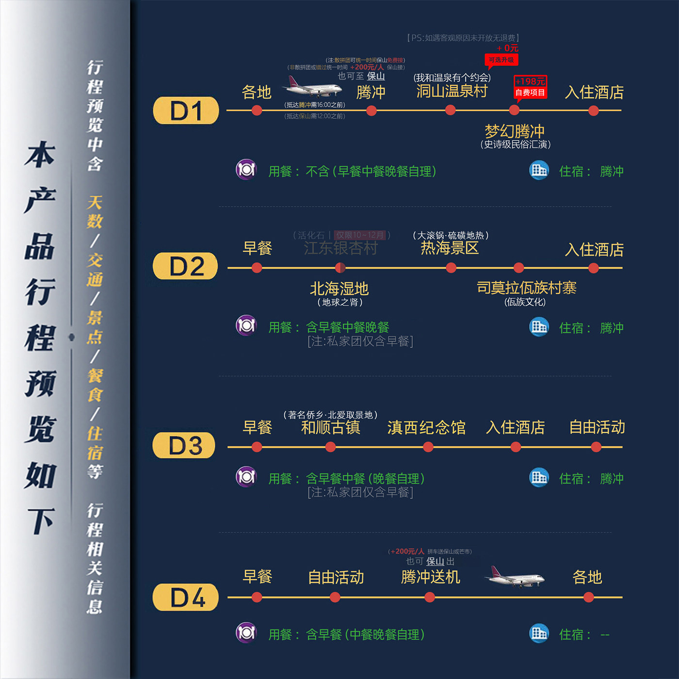 本行程专为兼顾差旅与度假需求的旅客设计,以保山为起点和终点,深入腾冲核心景区。4日纯玩私家团灵活安排时间,既可高效完成商务事务,又能沉浸于温泉疗愈、古村漫步等放松体验。独立成团、专属用车,保障差旅人士对私密性与效率的双重需求,是商务出行后犒赏自己的理想选择。