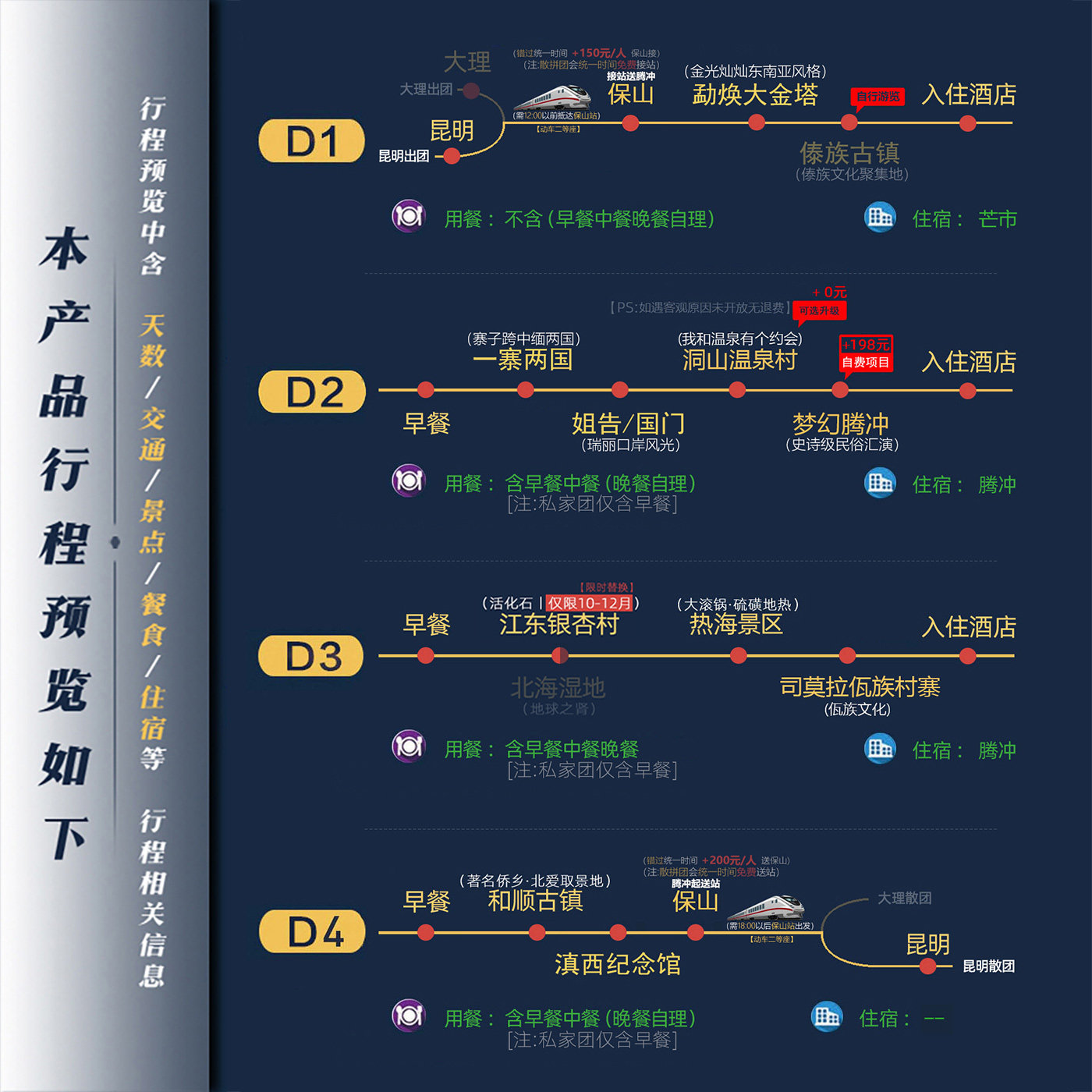 从昆明出发,搭乘便捷动车快速抵达芒市、瑞丽、腾冲等目的地,全程交通无缝衔接,极大节省差旅时间。小团精品设计(通常6-10人),既保障私密性又提升行程灵活性,特别适合出差途中顺带度假的商务人士。4日行程紧凑而不仓促,白天高效游览,晚上可处理工作,真正实现“差旅+度假”双效合一。