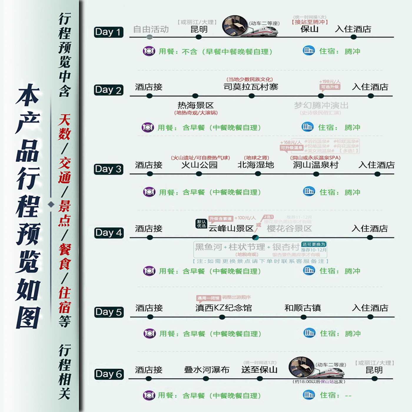 从昆明出发,搭乘便捷动车直达保山,无缝衔接腾冲目的地,大幅节省差旅途中耗时。全程采用独立私家团模式,2人即可成行,行程安排灵活,既适合商务出差后的放松度假,也便于临时调整日程。专属用车与导游服务,让差旅人士在高效移动之余,享受私密、舒适的旅行体验,真正实现工作与休闲的完美平衡。