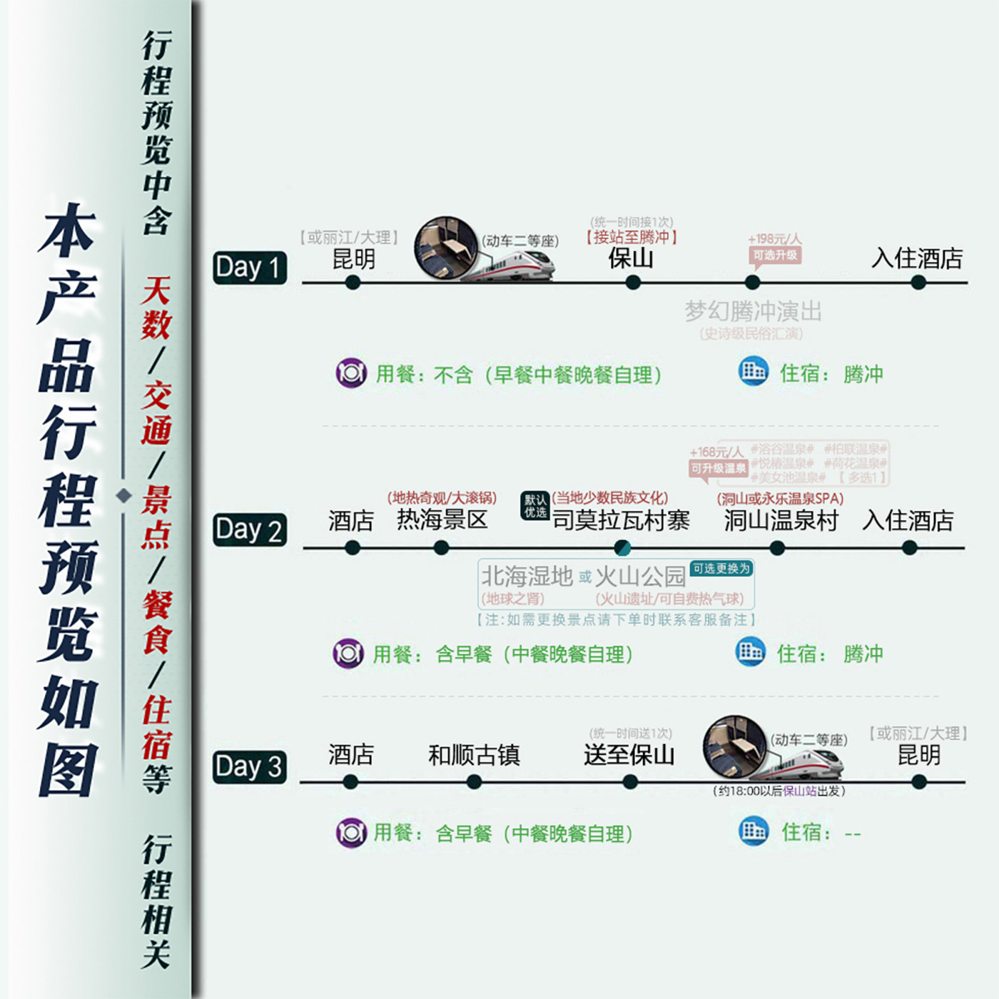 从昆明出发,乘坐便捷动车快速抵达保山/腾冲,全程交通无缝衔接,节省差旅时间。3日私家团采用独立成团模式,行程灵活可控,特别适合商务人士在完成工作后即刻开启放松之旅。无需拼团等待,专属导游与车辆保障高效出行,真正实现‘上午开会、下午泡温泉’的差旅新体验。