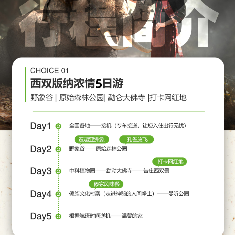 本行程以“热带雨林生态+民族文化”为主题,整合植物园探秘、野象追踪、傣族风情体验等多元内容,形成连贯而深度的主题旅行线路。差旅人士无需自行规划琐碎细节,即可获得系统化、有层次的文化与自然双重体验。