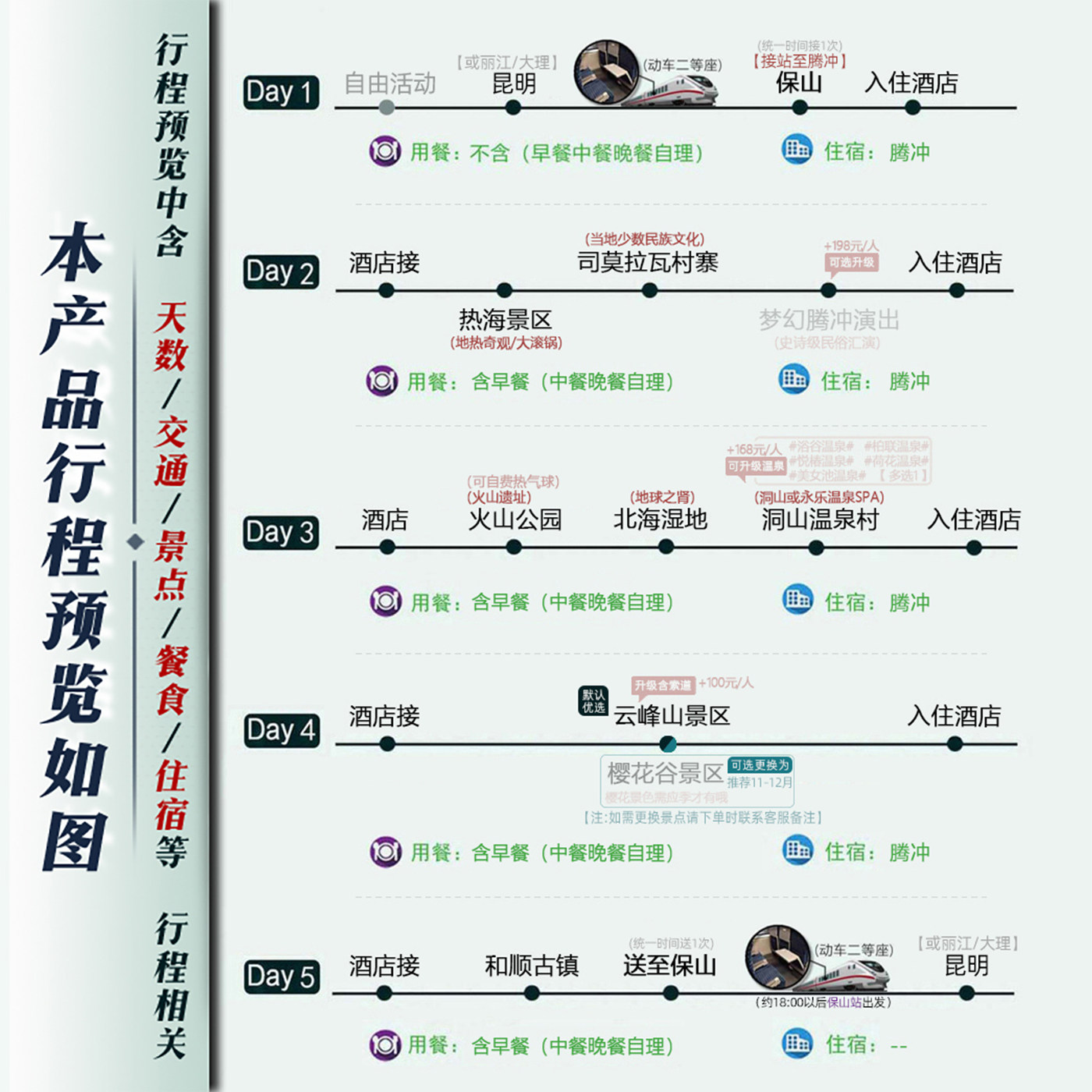 本行程专为兼顾差旅与度假需求的旅客设计,从昆明乘坐舒适动车快速抵达保山/腾冲,节省旅途时间,提升出行效率。动车班次稳定、准点率高,特别适合在完成昆明公务后无缝衔接5日私家度假行程,实现工作与放松的完美平衡,无需额外安排复杂交通,真正实现说走就走的差旅+度假体验。