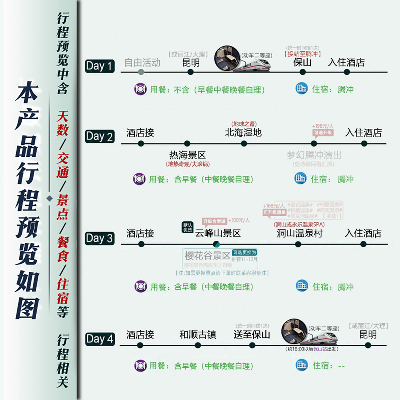 从昆明出发,搭乘便捷动车快速抵达保山/腾冲,全程交通无缝对接,特别适合出差途中顺道度假的商务人士。4日纯玩私家团设计,无需拼团等待,行程灵活可控,既满足高效出行需求,又兼顾深度放松体验。无论是会议间隙还是项目结束后的犒赏之旅,都能在温泉氤氲与山水清幽中迅速切换状态,实现真正的“差旅融合”。