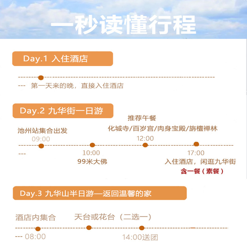本行程精准匹配差旅人群对时间效率与文化体验的双重需求。从池州出发,仅需短途接驳即可抵达九华山景区。三天两晚行程包含市区与山上各一晚住宿,兼顾工作联络便利性与景区深度游览。重点覆盖天台寺、化城寺等著名寺庙,结合索道观光节省体力,让商务旅客在紧凑日程中高效完成祈福、人文旅行与自然观景三大目标。