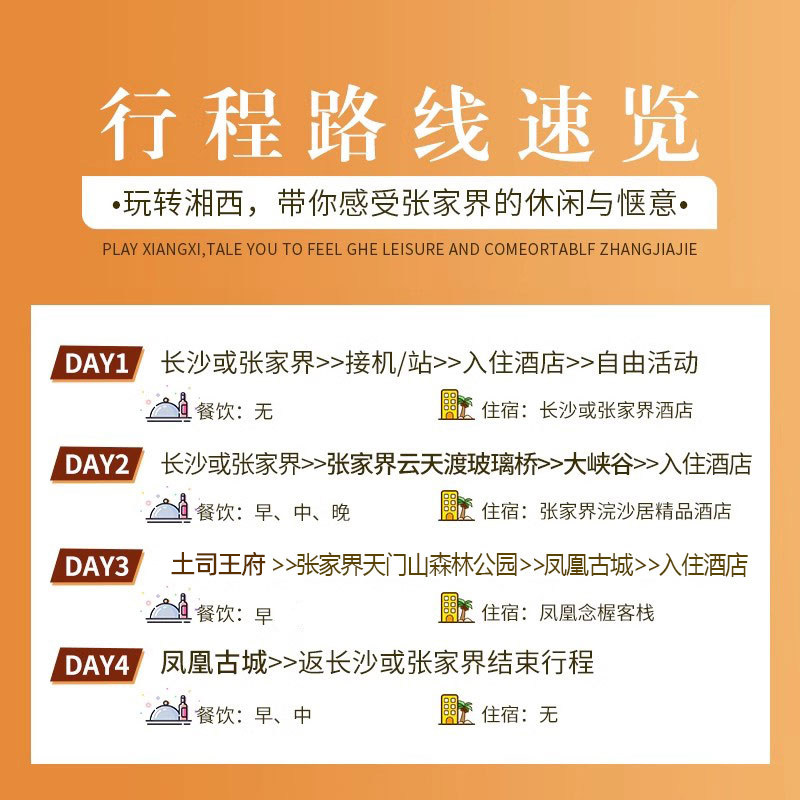 精心设计的4天3晚行程,完美适配现代职场人的碎片化假期——仅需请2天年假,加上周末即可完成一场跨城深度游。从长沙出发当天即达张家界,最后一天傍晚可返程,最大限度减少请假天数,让忙碌的差旅人士无需牺牲过多工作时间,就能享受高品质的山水人文之旅。