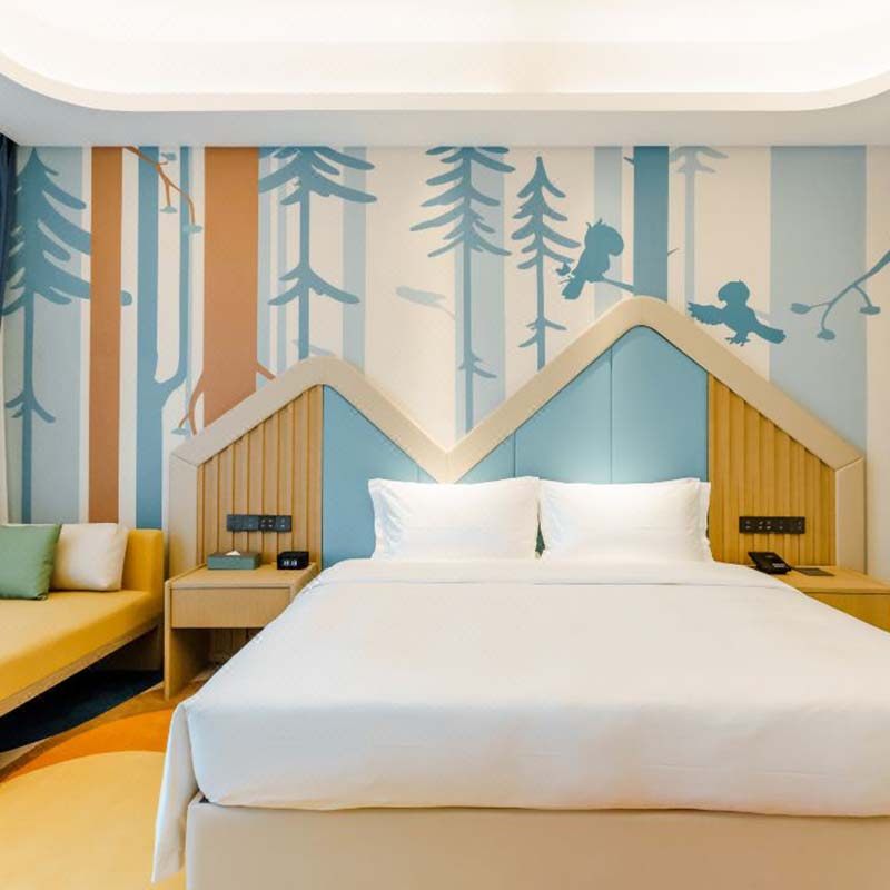 酒店提供专属亲子主题房,从墙面彩绘到床品布置均融入卡通元素,营造“七彩世界”的梦幻氛围。对于带着孩子的差旅家庭而言,这不仅是一间客房,更是旅途中的游乐延伸。孩子一进房间便兴奋不已,有效缓解长途奔波的疲惫,让短暂的差旅时光充满欢笑与温馨回忆。