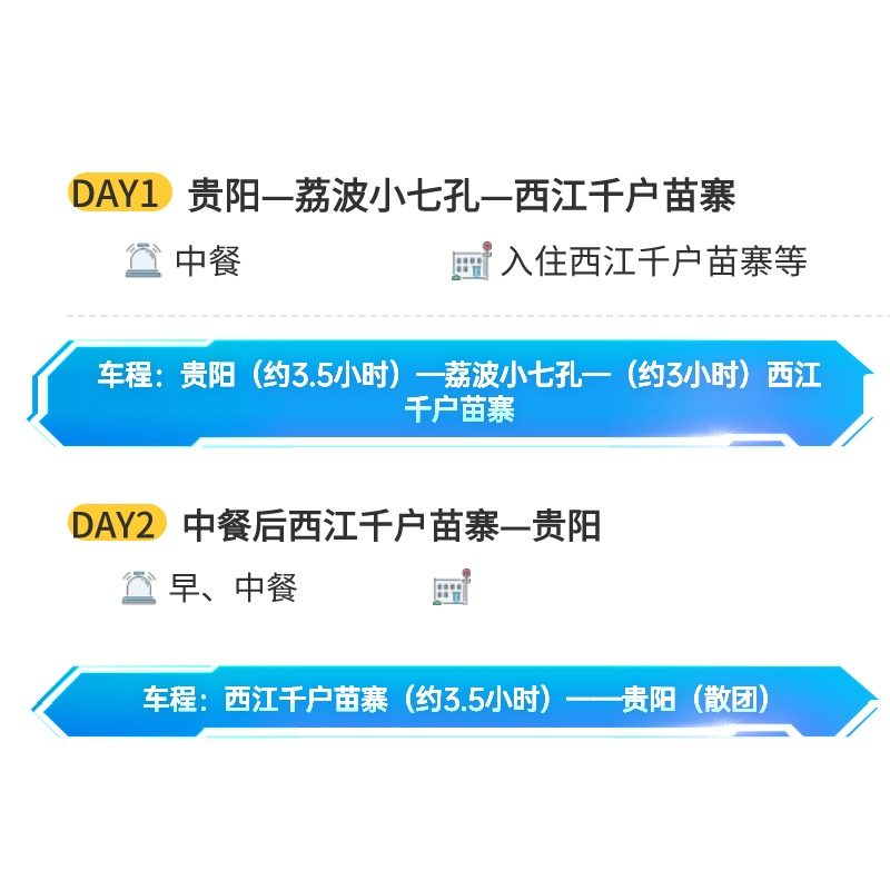 本行程专为差旅人士设计,从贵阳出发,高效衔接荔波小七孔与西江千户苗寨两大贵州核心目的地。全程仅需2天1晚,时间紧凑却不仓促,特别适合周末出差顺带放松的商务旅客。交通安排合理,减少无效等待,让您在有限时间内深度体验自然奇观与民族文化,兼顾效率与休闲,真正实现“出差即度假”。
