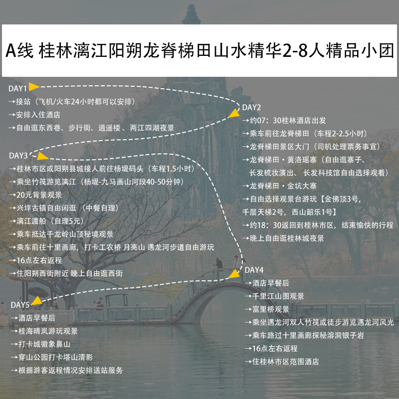 采用精品小团模式,人数控制在合理范围,确保服务品质与行程效率。5天4晚的时长精准覆盖周末+3个工作日,特别适合利用年假或调休进行短途差旅度假。路线涵盖龙脊梯田、漓江、阳朔三大核心IP,避免走马观花,让有限的差旅假期产生最大化的体验价值。