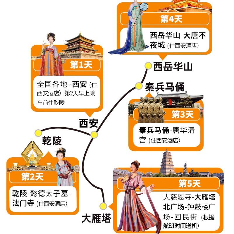 5天4晚的行程设计紧凑而不仓促,既能覆盖西安核心文化地标——兵马俑、华山、大雁塔、大唐不夜城等,又留有适度缓冲时间应对差旅变动。无论您是周五抵达周日返程,还是中间穿插会议,都能无缝衔接,最大化利用假期或差旅空档。
