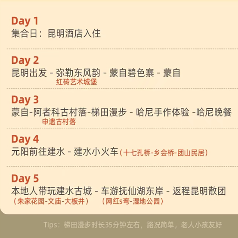 线路以省会昆明为枢纽,往返交通便利,适合全国差旅人士经昆明中转后无缝衔接度假行程。5天4晚设计合理利用周末+3天年假即可完成,最大化利用碎片化假期,实现‘出差+度假’一体化,提升时间投资回报率。