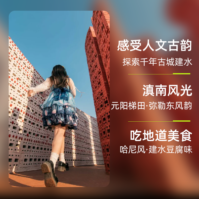 本行程支持1人独立预订,无需拼团等待,特别适合商务差旅人士在完成工作后灵活衔接休闲度假。昆明出发,5天4晚深度游覆盖建水、弥勒、东风韵等精华目的地,行程紧凑而不仓促,让您在有限时间内高效体验云南多元文化与自然风光,兼顾效率与放松。