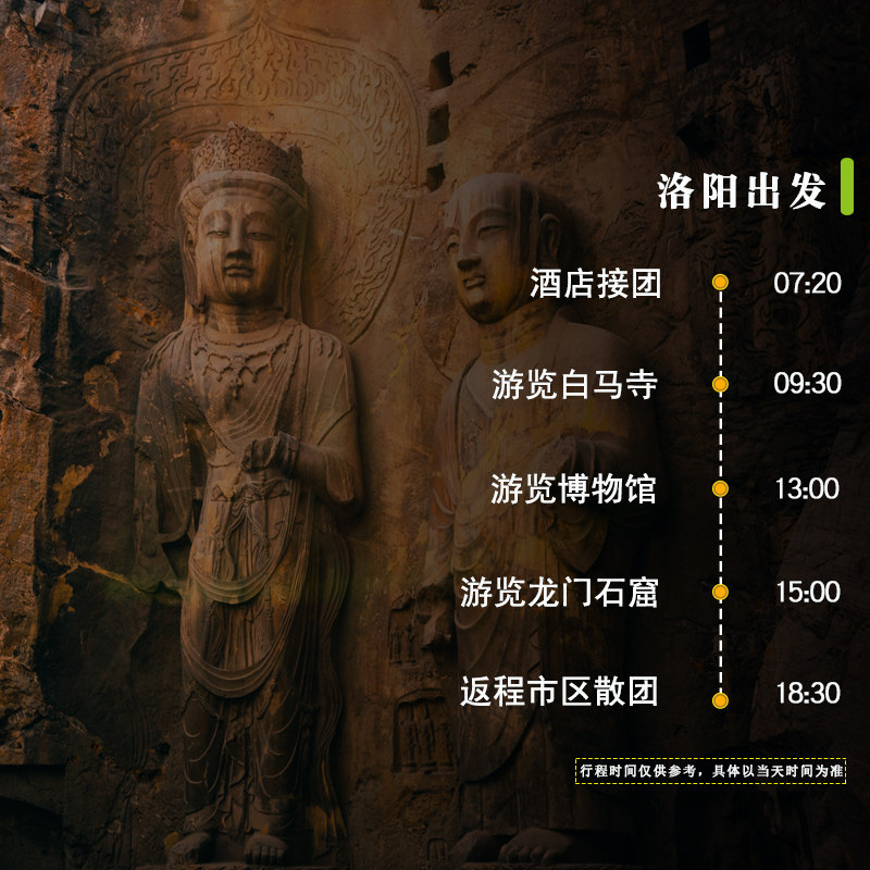 区别于普通观光团,本产品以“历史文化”为主题精心编排路线,每个景点均配备深度讲解与背景知识铺垫。从龙门石窟的卢舍那大佛到白马寺的印度风格佛殿,再到博物馆中的唐三彩珍品,确保您在有限时间内获得最大文化收获,实现高质量差旅休闲。