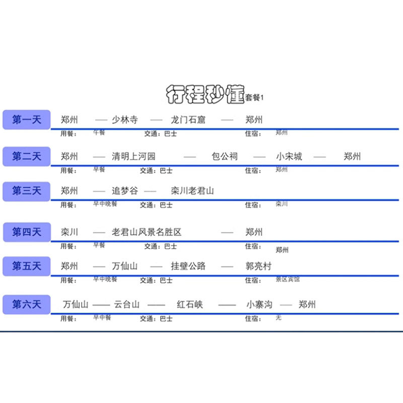 6天5晚的行程设计精准匹配国内差旅常见周期——既可衔接周末形成小长假,又能嵌入项目间隙。相比3-4天短途游,此行程有足够时间深入体验河南山水人文;相比7天以上长线,则避免过度占用工作日。住宿与景点节奏张弛有度,确保返程后能迅速投入工作。