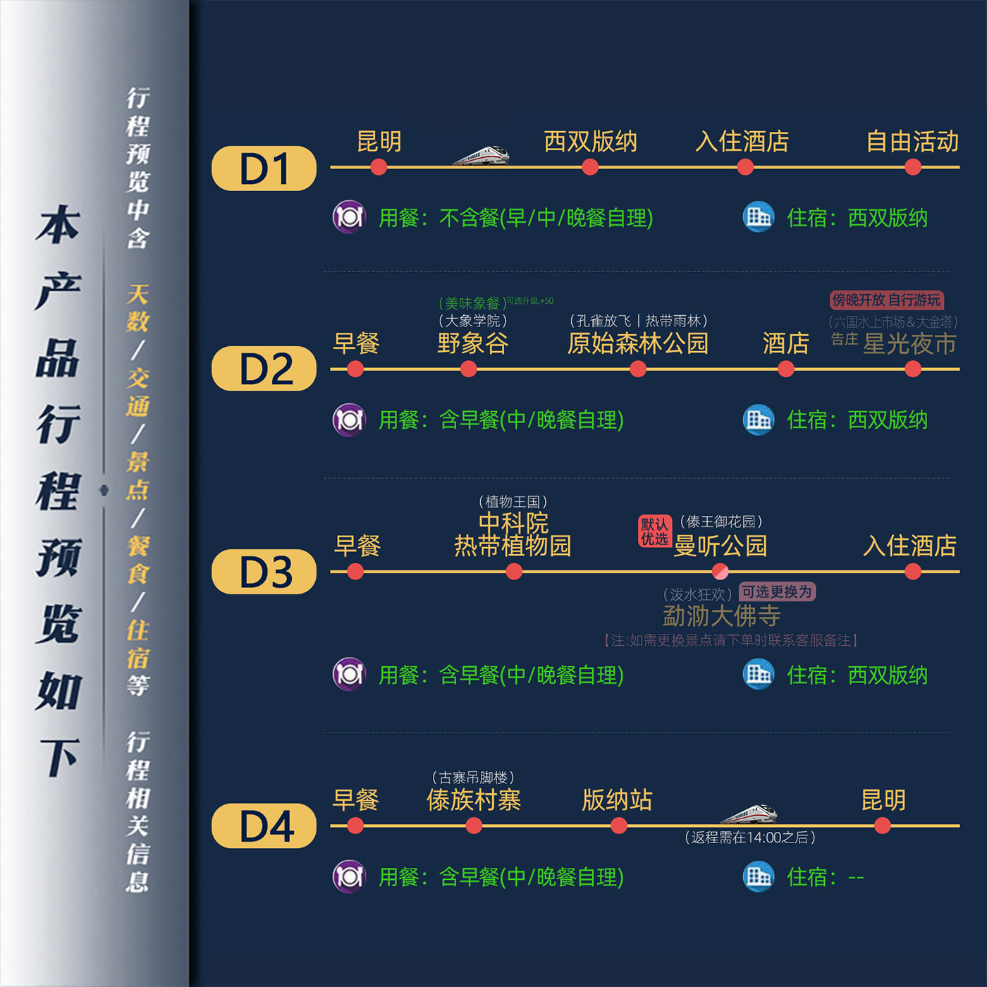 本行程采用昆明至西双版纳动车接驳,高效便捷,节省旅途时间,特别适合商务人士或时间紧凑的差旅人群。全程4日私家团配置,2人即可成行,无需拼团等待,行程自由度高,既满足高效出行需求,又兼顾深度度假体验,是差旅与休闲完美融合的理想选择。