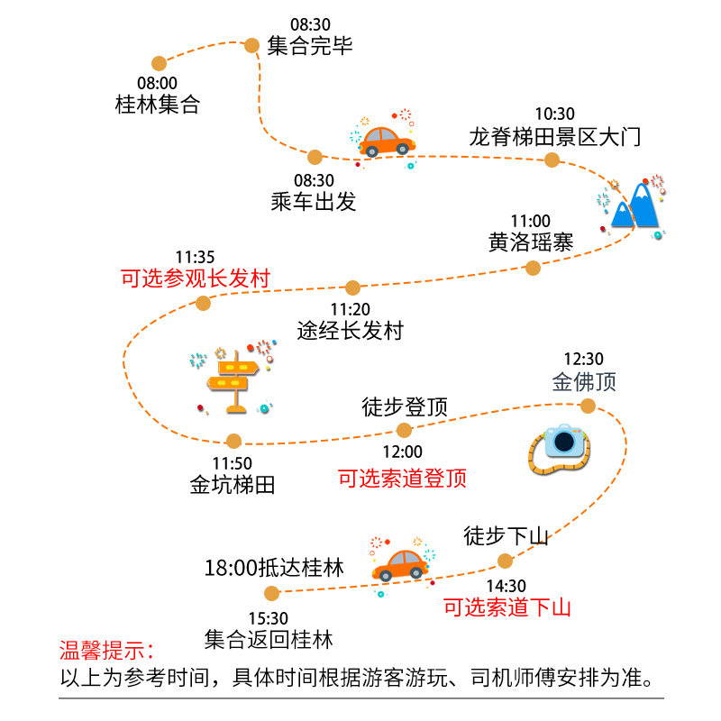 精心设计的一日游行程,从桂林市区出发并当日返回,完美契合差旅人士紧凑的日程安排。清晨出发,傍晚归城,不影响第二天的会议或航班,真正实现‘白天看梯田,晚上回酒店’的高效度假模式,让商务出行也能拥有诗意片刻。