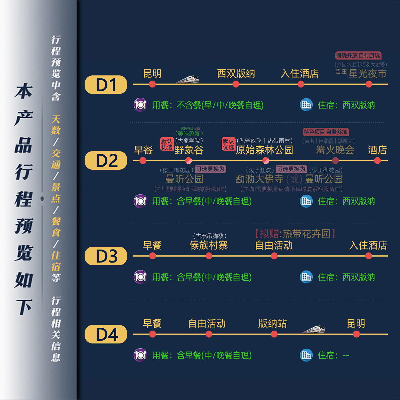4天3晚的行程设计精准平衡时间投入与体验深度,首日昆明出发乘动车直达版纳,次日深入野象谷与傣寨,第三日沉浸文化与美食,末日返程。无购物、无隐形消费,纯玩模式确保每一分钟都用于真实体验。对差旅人士而言,无需额外请假,周末加两天即可完成一次高质量度假,实现‘短假长享’的高效旅行目标。