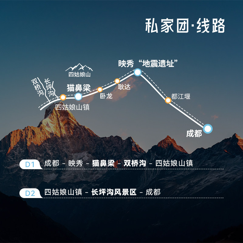 专为差旅人士设计的私家团产品,打破传统团队游人数限制,1人即可下单成行。无论您是商务出差途中想短暂逃离城市喧嚣,还是独自一人寻求片刻宁静,本线路都可随时响应您的出行需求。从成都出发,2天1晚高效安排,无需等待拼团,节省宝贵时间,真正实现‘差旅+度假’无缝衔接。