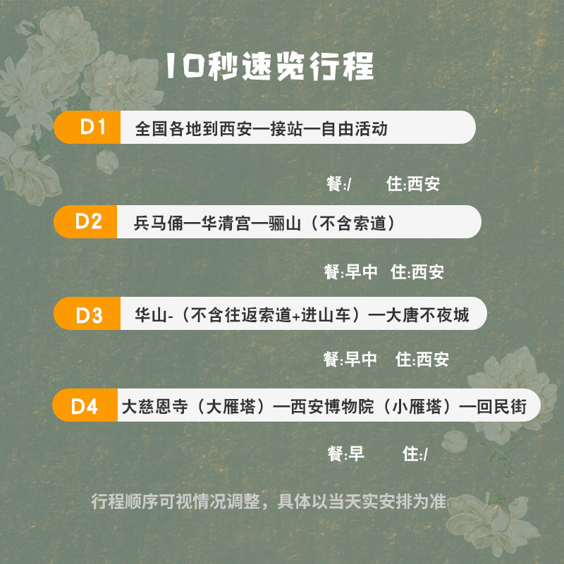 本产品以‘差旅友好’为核心设计理念,包往返高铁票,免除自行购票麻烦;4天3晚行程科学分配时间,白天游览兵马俑、华山等标志性景点,夜晚沉浸于大唐不夜城的灯光秀与特色表演。从郑州、武汉、南京等20余个城市均可便捷出发,真正实现‘一下高铁即入景区’的无缝衔接。无论是独自出差还是临时休假,都能轻松开启一场兼具效率与深度的文化之旅。