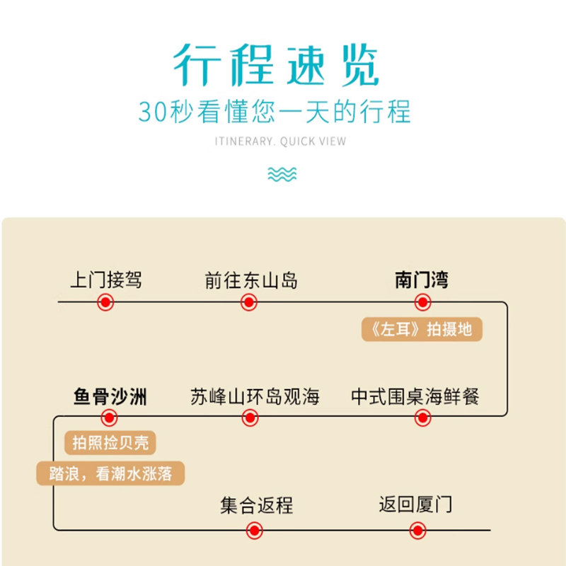 专为商务人士与短途旅行者设计,本线路从厦门岛内酒店7点免费上门接送,19点准时返回,全程无缝衔接,不耽误次日工作。单程车程约3小时,合理安排南门湾打卡、苏峰山环岛公路观光及鱼骨沙洲快艇登岛等精华景点,一日之内体验海岛度假与差旅效率的完美融合,真正实现‘白天看海,晚上回城’的高效差旅节奏。