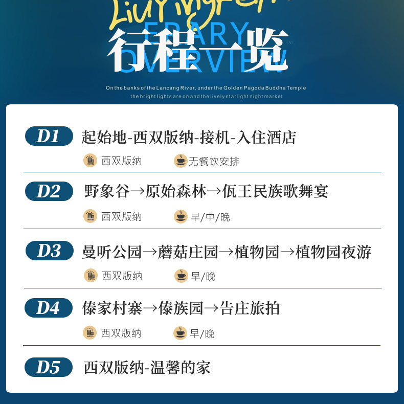 本行程支持1人独立成团预订,特别适合出差途中临时起意或时间紧凑的商务人士。无需等待拼团,随时出发,将差旅与休闲无缝衔接。5天4晚的行程节奏张弛有度,既可深度体验西双版纳的民族文化,又不会影响工作安排,真正实现“说走就走”的高效度假模式。