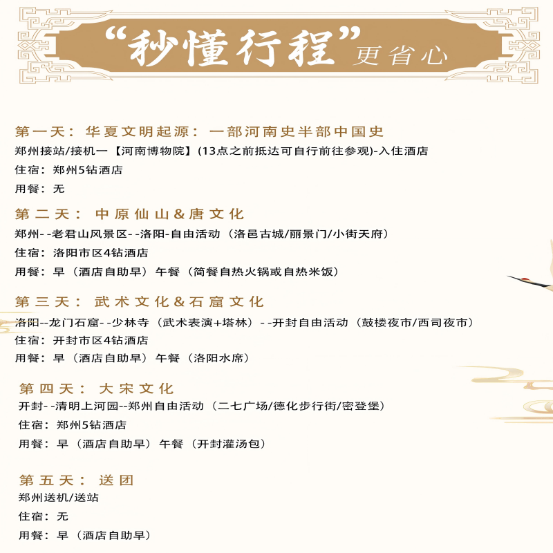 本行程专为差旅人士设计,支持1人独立成行,无需拼团等待,灵活安排出差间隙的休闲时光。5天4晚行程紧凑高效,涵盖洛阳老君山、龙门石窟、少林寺及开封清明上河园等核心文化地标,既满足商务出行节奏,又深度体验中原千年文脉,让差旅不再枯燥,而是充满历史韵味与精神滋养的旅程。