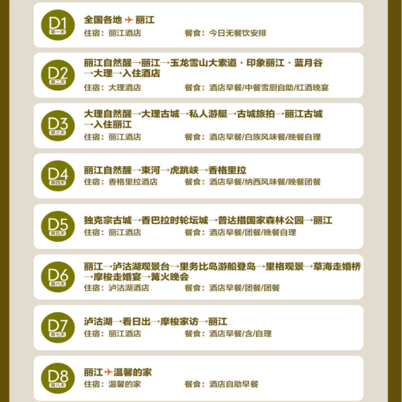 针对假期有限的差旅人群,行程科学串联丽江玉龙雪山冰川大索道、大理洱海、香格里拉普达措及泸沽湖四大核心IP,在8天内高效覆盖高原、湖泊、古城、民族村落等多元景观。无需自行研究路线或担心交通衔接,一站式解决“想去太多地方但时间太少”的痛点,让短暂假期价值最大化。