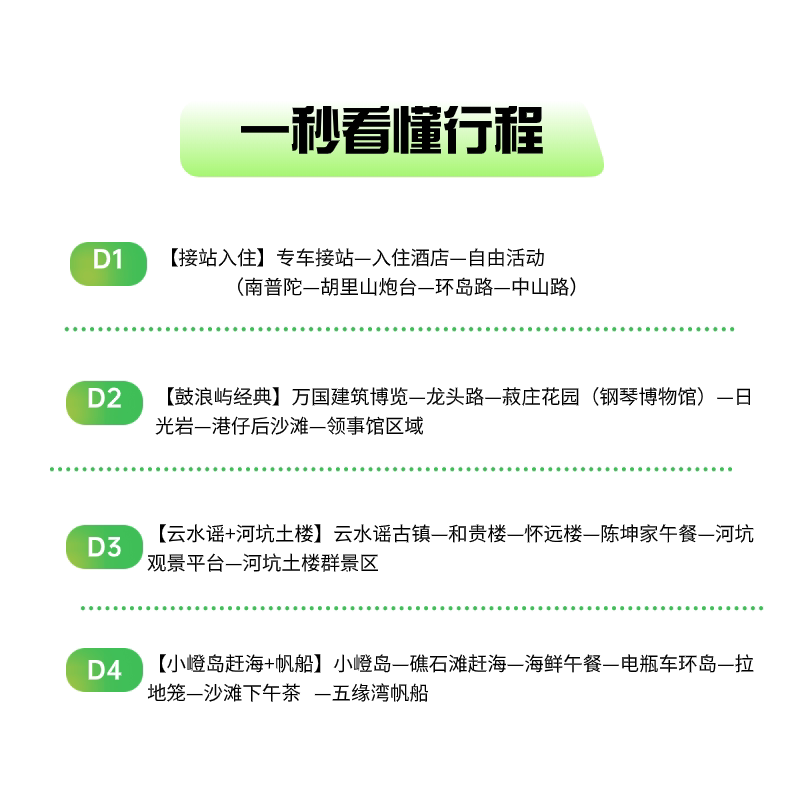 精心规划4天3晚行程,最大化利用周末或短期出差空档:首日聚焦厦门鼓浪屿核心景点,次日转场漳州云水谣土楼群,第三日体验帆船与小嶝岛赶海,末日返程前享用闽南早茶。全程交通由专车衔接,省去换乘烦恼;住宿优选商务友好型酒店,保障休息质量。如此高效编排,让您在短短数日内深度体验山海闽南,实现差旅与度假的无缝切换。