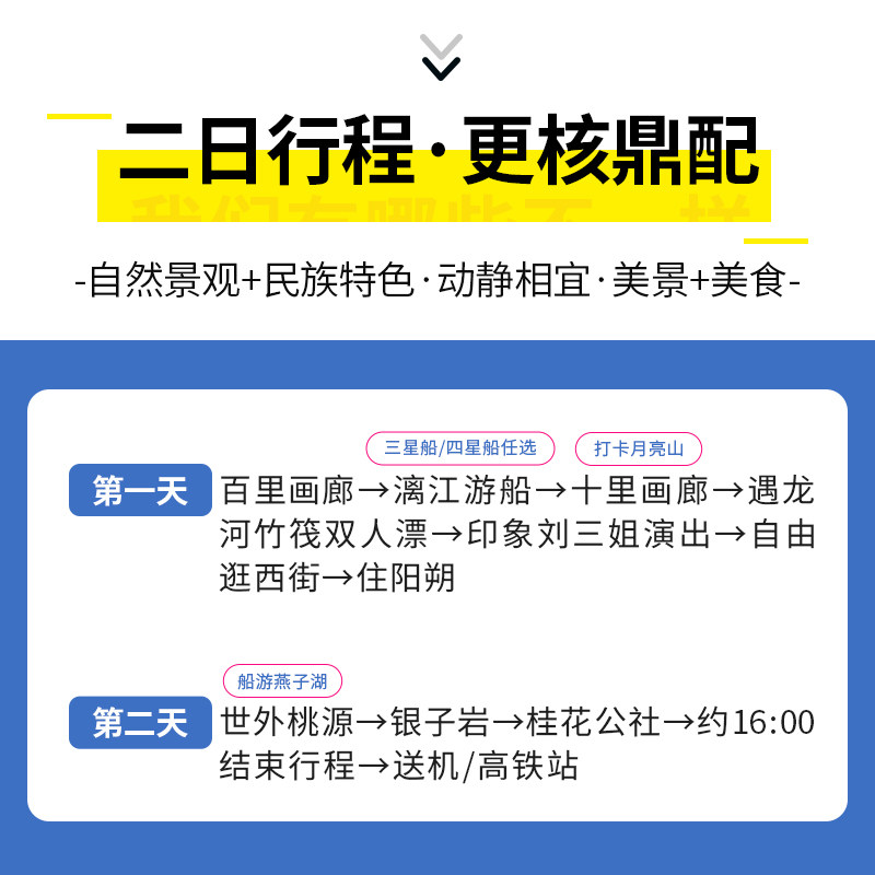 专为差旅人群设计的2天1晚紧凑行程,覆盖桂林阳朔核心景点,包括漓江游船、遇龙河竹筏等经典项目,在有限时间内最大化游览体验。行程节奏合理,不赶不拖,既满足观光需求,又避免过度疲劳,适合利用周末或工作间隙快速充电。