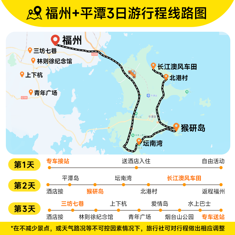 专为忙碌职场人设计,3天2晚行程节奏张弛有度:第一天下午抵达后游览三坊七巷,第二天全天畅游平潭岛核心景点,第三天上午自由活动后即可返程。全程无冗余环节,确保您在短暂假期中最大化体验价值,周一准时回归工作岗位,实现工作与生活的高效平衡。