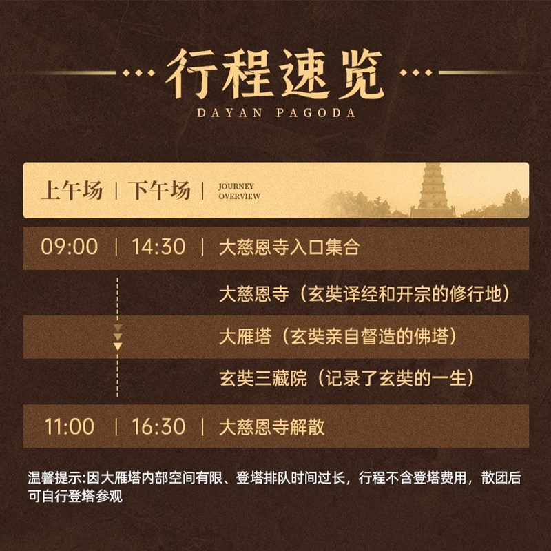 产品已包含大雁塔及大慈恩寺全部门票费用,无需现场排队购票或额外支出。差旅期间财务报销流程复杂,提前锁定全包式服务可简化费用管理,避免临时开支影响预算控制,让您专注于核心商务任务的同时,轻松完成文化打卡。