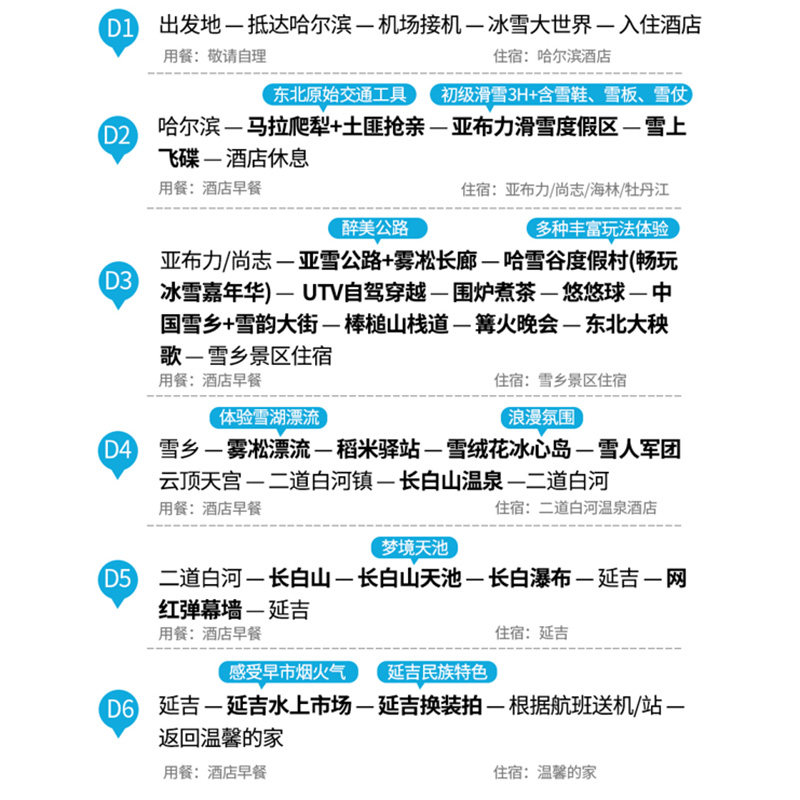 行程巧妙串联黑龙江与吉林核心冰雪目的地——从哈尔滨出发,经亚布力、雪乡,延伸至延边朝鲜族自治州及长白山,覆盖东北冬季精华景观。差旅人士可在6天5晚内高效体验多元文化与自然奇观,节省中转时间与精力。路线规划科学,交通衔接顺畅,特别适合时间紧凑但追求深度体验的商务旅行者。