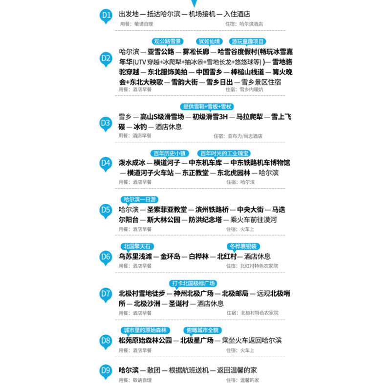 行程以哈尔滨为起点和终点,便于搭乘高铁或航班抵达后无缝衔接旅游安排。无论是从全国各城市飞抵哈尔滨出差,还是结束会议后直接开启度假,都能高效利用时间,避免中转奔波,最大化差旅效率与休闲体验的平衡。