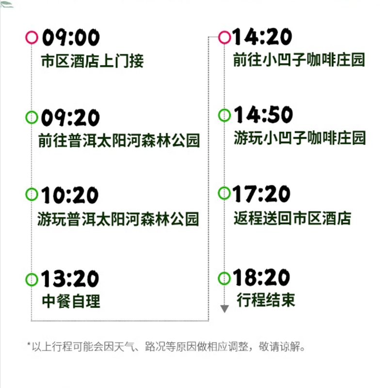 本产品精心规划为一日游行程,涵盖森林公园核心景点与咖啡庄园体验,路线紧凑高效,无需过夜安排。特别适合周末出差顺道游玩或会议间隙半日休整的旅客。早上出发、傍晚返回,既不耽误工作,又能深度感受普洱自然与人文魅力,真正实现‘高效度假’。