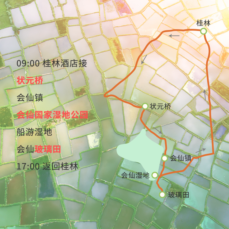 专为商务差旅人士设计,本行程支持1人单独预订,无需拼团等待,极大提升出行效率。无论您是临时出差至桂林,还是会议间隙想快速放松身心,只需半天至一天时间,即可深入会仙湿地、玻璃田与状元桥等小众秘境,避开人流高峰,享受专属私家团服务。包车直达、行程自由、时间可控,真正实现“说走就走”的差旅度假体验。