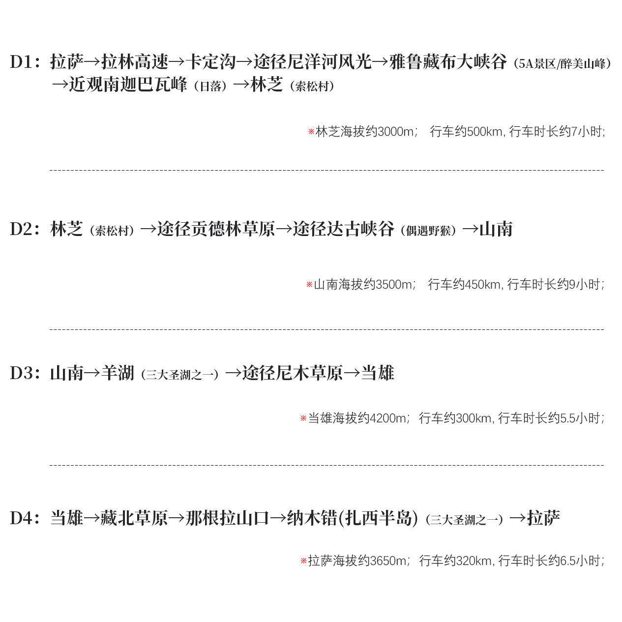 行程以拉萨为枢纽,串联林芝、山南两大目的地,完美契合从拉萨进出的差旅动线。无论您是从外地飞抵拉萨参会,还是在当地多点考察,均可轻松接入此环线。全程专车接送、酒店连住,省去频繁搬运行李的麻烦,提升差旅效率与舒适度。
