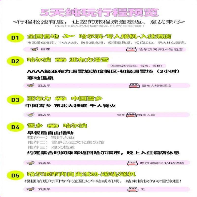 精心设计的5天4晚行程,完美适配周末+年假或调休组合,最大化利用有限假期。路线衔接流畅,减少无效交通耗时,确保每日核心体验饱满而不疲惫。对于时间宝贵的差旅者而言,这意味着无需请长假即可完成一次高品质东北全景之旅,实现‘短假长体验’的高效度假目标。