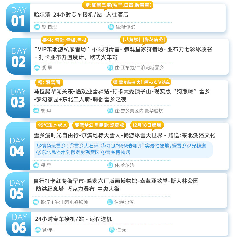 承诺全程纯玩,无任何强制购物点或隐形消费。差旅人士时间宝贵,每一分钟都应花在真正值得体验的冰雪景观与文化活动中。从雪乡童话木屋到亚布力雪道,从冰滑梯到温泉SPA,所有安排均围绕核心体验展开,确保您的假期纯粹而高效。