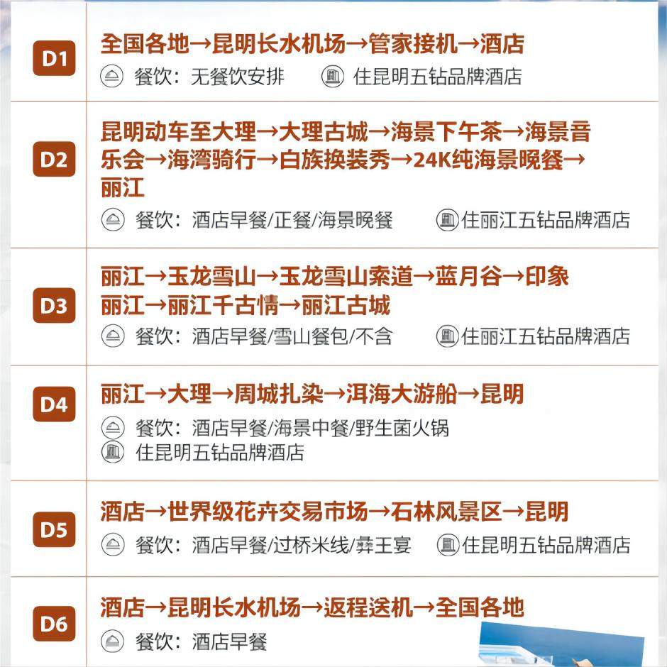 专为注重效率与舒适度的差旅人群设计,全程入住豪华五星酒店,确保您在奔波工作后能享受高品质休憩环境。无论是昆明的城市便利、大理的洱海景观房,还是丽江古城旁的静谧居所,均经过精心挑选,兼顾交通便捷与私密舒适,让您的差旅假期从住宿开始就与众不同。