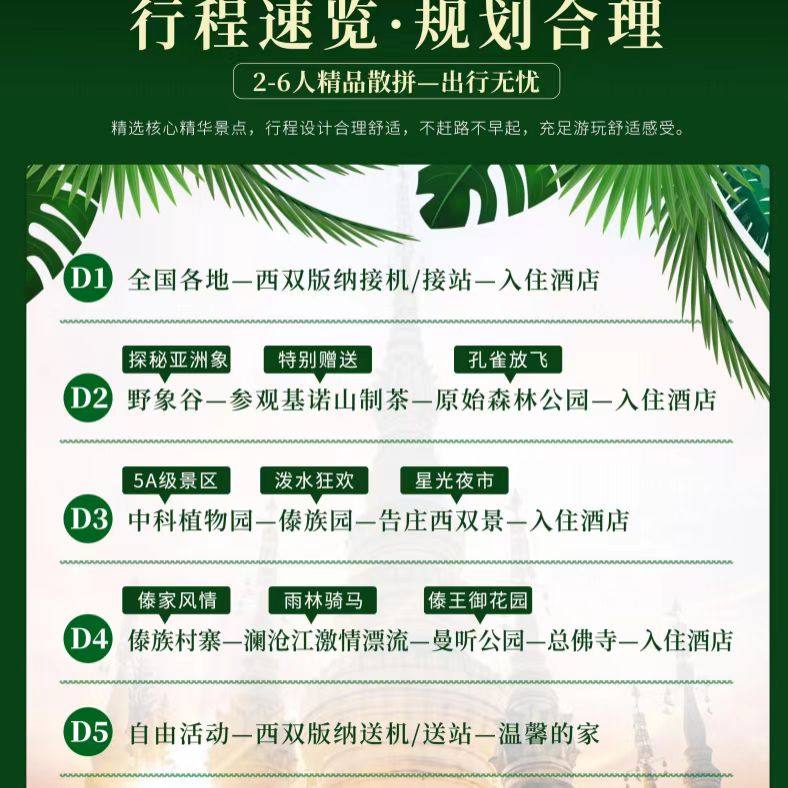 本行程支持1人独立预订,无需拼团等待,特别适合商务人士或独自出差后顺道度假的旅客。无论您是临时调休、会议结束后的短暂停留,还是希望在差旅间隙放松身心,都能即刻启程,灵活安排时间。5天4晚的行程紧凑而不仓促,兼顾效率与体验,让您的西双版纳之旅无缝衔接工作与休闲。